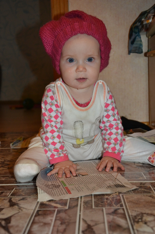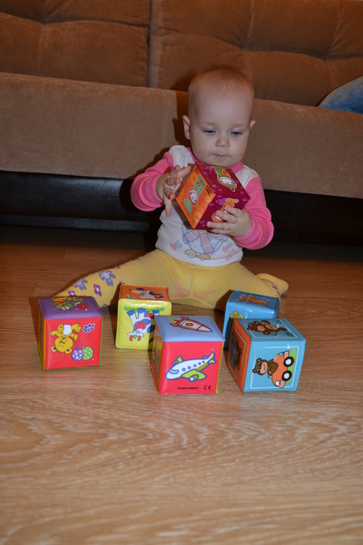 - любит играть в ку-ку, ладушки, вообще стучать ладошками по всем ровным поверхностям, подумываю ей барабан купить))) разбирает пирамидку, иногда по кольцам, а иногда просто перевернет вверх ногами, любит рушить башенки из кубиков, катает мячи и всё ещё любит игру баран-баран-бум, шуршит пакетиками и грызет мягкие книжки, пульты, играет со шторами и тюлью, любит завернуться в нее и попрыгать на коленках.