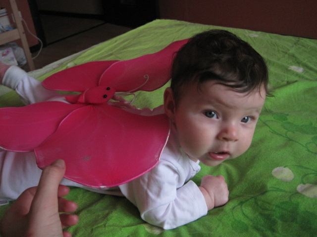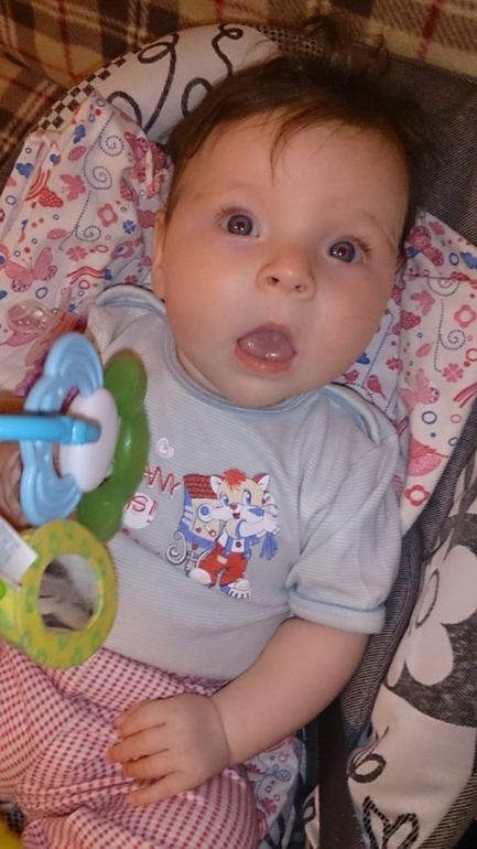 Вообще, с каждым днем она меняется и внешне и в развитии, до конца так и не можем определить на кого она похожа). Из умелок - активно переворачиваемся, очень хочет сесть, постоянно торс в положении 45 градусов от пола, особенно когда на шезлонге лежит,играет игрухами, очень любит трогать лицо человека,который носит ее на руках, хватает и стягивает очки и у меня в том числе))), держит бутылочку с водой, лежа на животе трется так, в попытках ползти что сантиметров 10 на пузе проползает, один раз встала на полностью вытянутые ручки! Кормлю грудью, правда есть стала беспокойно, корчится, сосет от силы минут 5 .
