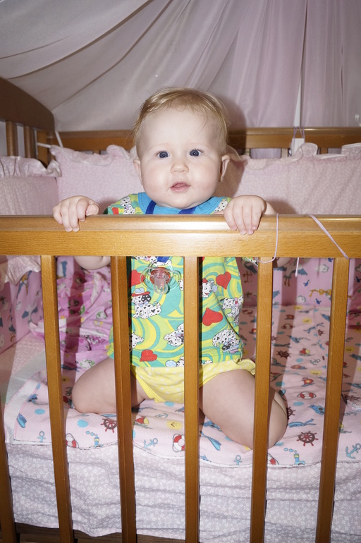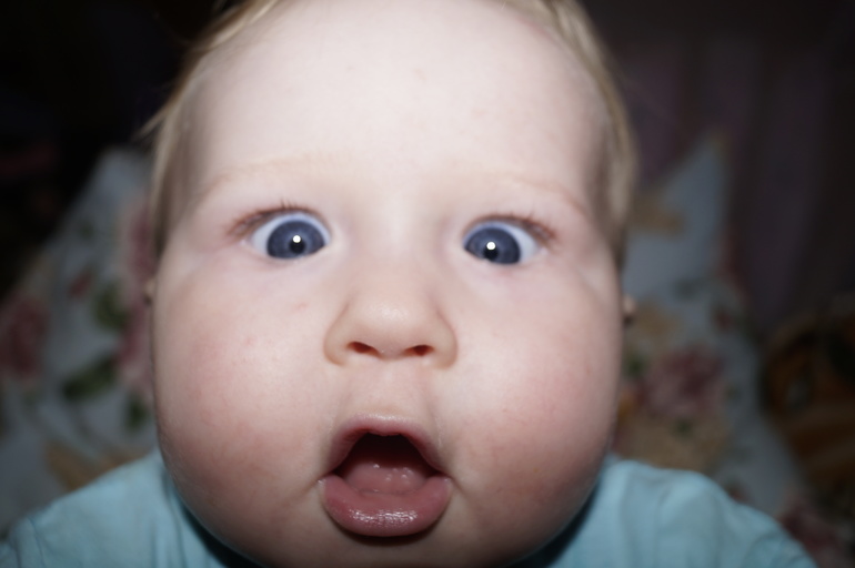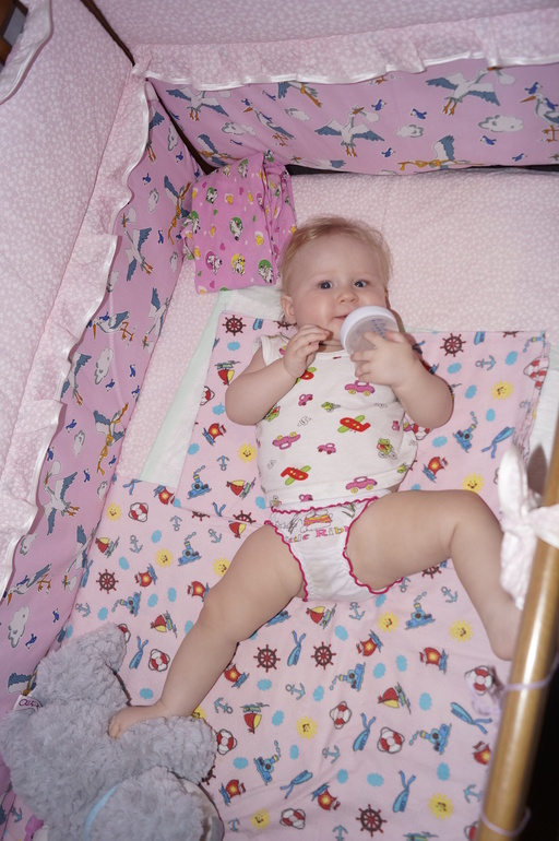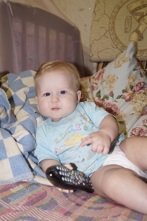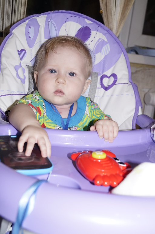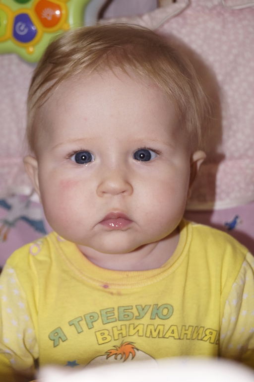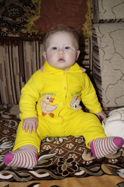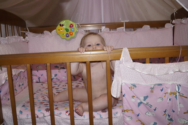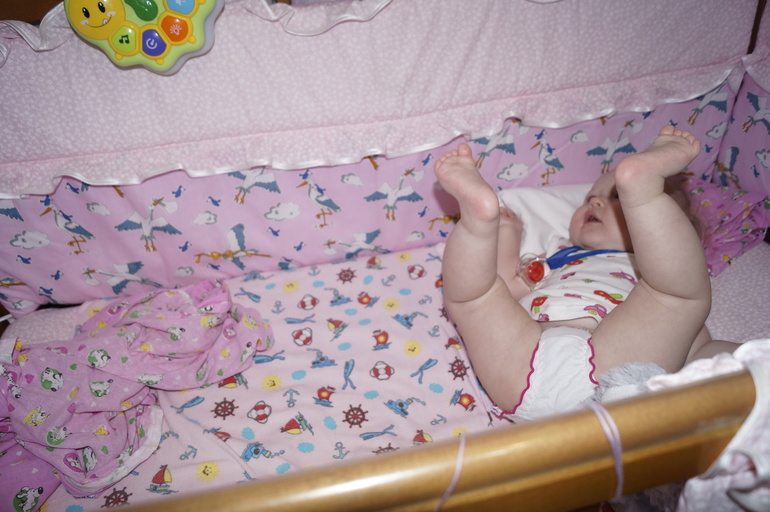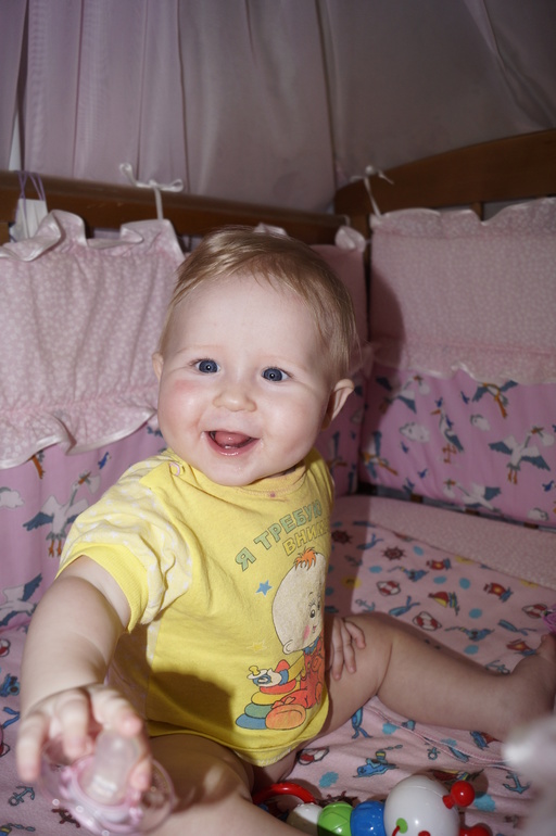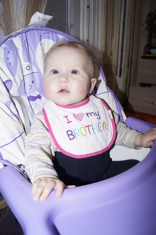 За этот месяц мы научились сидеть и вставать на коленки не только в кроватке, но и умудряется в ванночке. Про рост и вес пока не знаем. 12 декабря на прививку. Там и посмотрим. Махать пока-пока не хотим. Я показываю как махать, а она берёт меня за руку и показывает, типа, ты сама маши, я не буду. Ма-ма и па-па тоже пока никак. Зато много других разных звуков, которые я даже не знаю как буквами описать. Ладушки мы не хотим. Начинаю хлопать , а Викуля вырывает ручки и улыбается загадочной улыбкой Джаконды. Мы такие же ручные. Зато нравится играть в ку-ку. Расплывается в улыбке как солнышко!!!! Теперь мы едим в стуле. Безусловно это намного удобнее, чем на подушке. Любим калякать во время еды. И научились рычать как тигрята. Рычит, значит, пугает. На дневной сон пока ещё пеленаю руки. Без пелёнки просыпается моментально и потом укачать очень трудно. А не выспавшись много капризничает. Пробовали варёную сгущёнку на зубок, погрызли свежий огурец, лизнули лимон. Укусила меня за нос. Больно-то как!!!!!