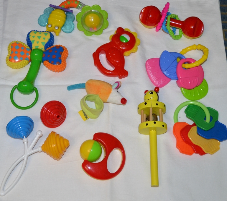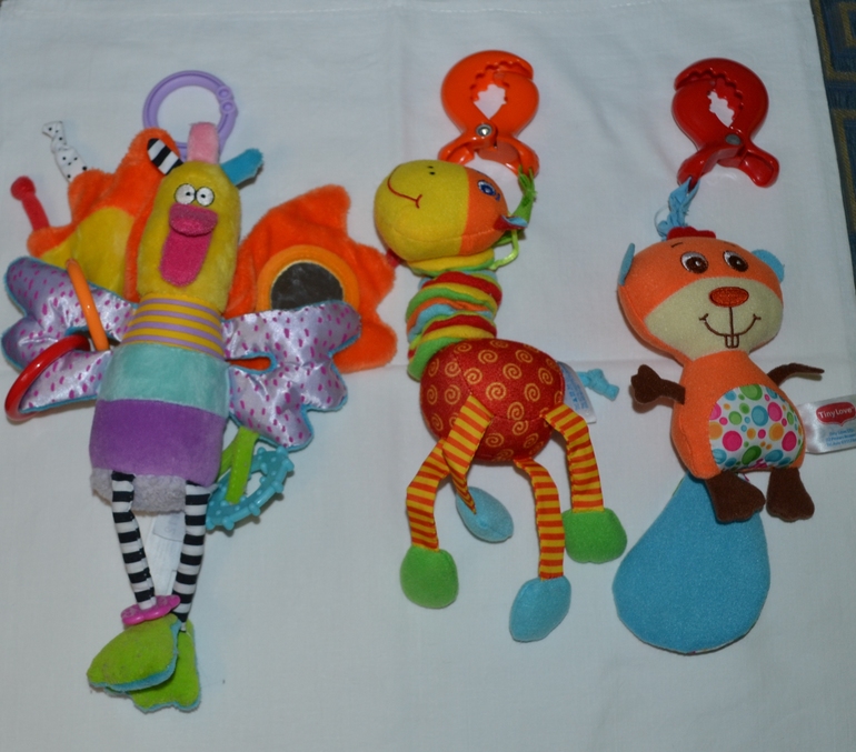 Погремушки. Одну Дашуля уже сломала, она кстати в первый месяц больше всех привлекала дочкино внимание, самая простая погремуха))) Единственная из всех мышка ну никакое впечатление не произвела, так что зря я её купила.