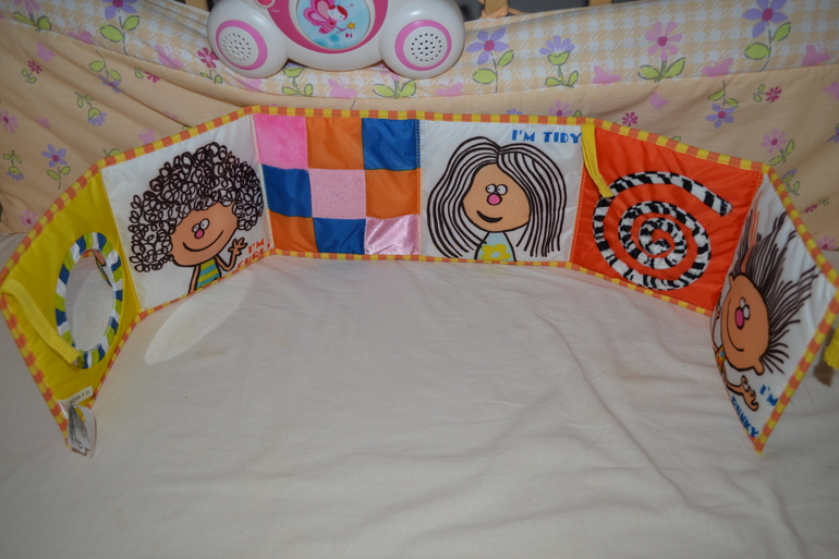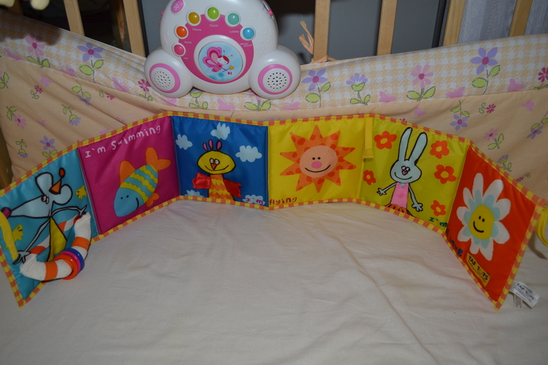 Книжка двухсторонняя Taf Toys. Ставлю в кроватку, дочке нравится с момента покупки и до сих пор, раньше просто рассматривала, сейчас дербанит ее изо всех сил туда сюда)))