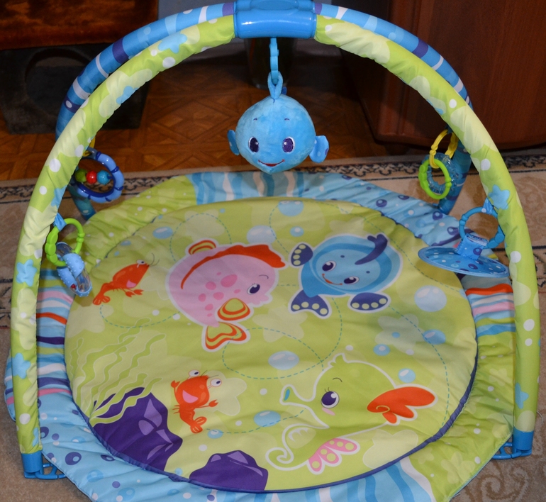 Хорошие у вас игрушки! Коврик такой у родственников был, знаешь, как пищалку дети нажимают? Ногой))) книжка тоже у вас хороша)) а дугу с мобиля не планируешь потом убрать? Я уберу, потому что у нас зверюги светятся, в веревочках провода запрятаны.