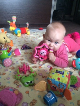 Из умелок - все, как и должно быть - крутится со спины на живот и обратно, и вокруг своей оси на животе, долго стоит на четвереньках, раскачивается взад-вперед, иногда заваливается из этого положения на бок на попу, уверенно хватает игрушки и перекладывает их из одной ручки в другую. Ой а еще если спросить где Тимоша (кот) сразу смотрит на пол и ищетУ нас уже вылезло два очень милых нижних зуба. Кушаем с удовольствием все овощи и каши (гречневую, рисовую, кукурузную), а вот фрукты ни в какую есть не хочет - яблоко, груша, чернослив, персик - все выталкивает языком либо вообще рот не открывает. Стала давать яблоко в нибблере, вроде в таком виде прокатило)) С 6 мес перешли на два дневных сна. Ну и еще наши фото