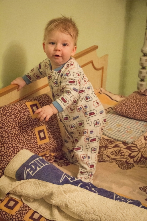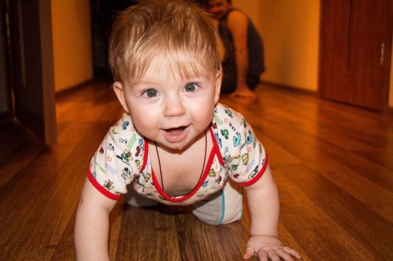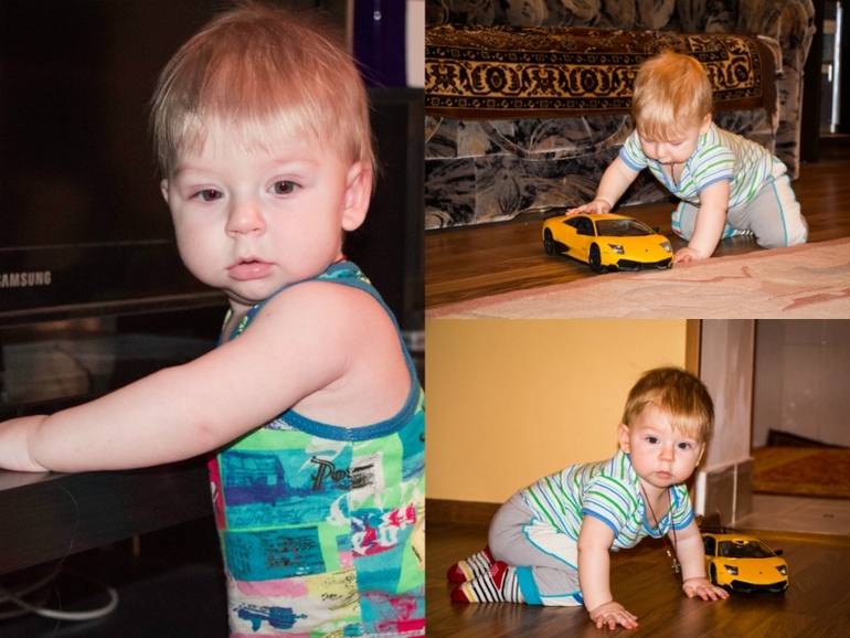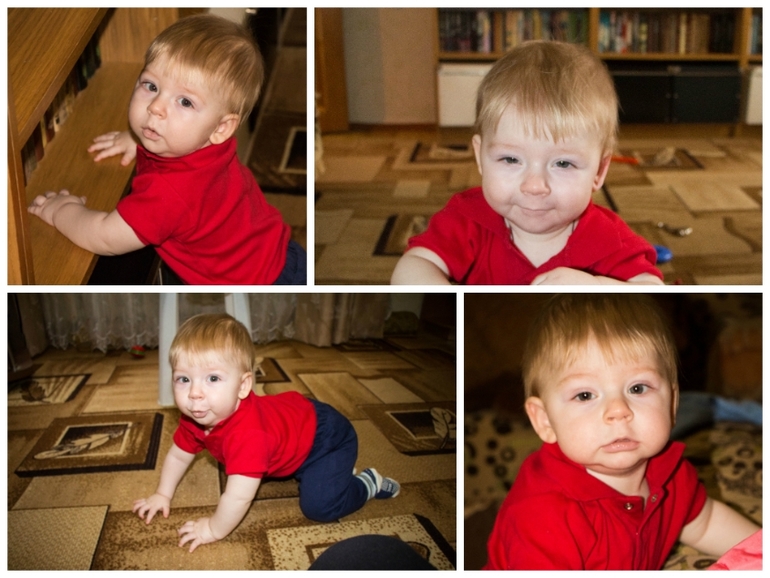 Этот месяц был самым богатым на умелки. Полноценно поползли, встаем у опоры и ходим вдоль неё, правда уж очень осторожно он это делает, прям робко, я бы сказала)))))) из-за того, что я постоянно страховала его и не давала падать или ещё из-за чего он сам теперь не садится с положения стоя, стоит ноет и ищет рукой меня, чтобы опереться и сесть, сейчас стараюсь не подходить,пусть учится сам падать и садиться)))) ползает с предметом в руках, стучит предметом о предмет. Все ковыряет пальчиком прикольно так, малюсенькую мусоринку на ламинате найдет и лежит пальчиком её ковыряет)
