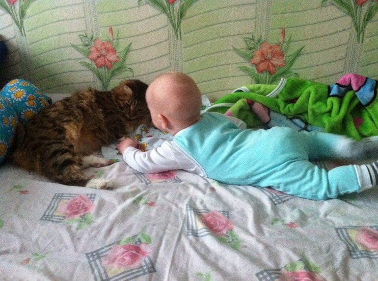 Кота вообще боготворим, за ним хоть на край света поползем, шерсть повыдергиваем, за усы похватаем. Кот не злится, либо сбегает, либо просто на метр отодвинется, а иногда и просто лежит, терпит)))