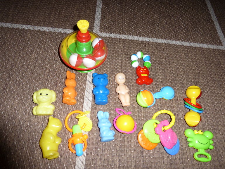 Итак, начнем... Погремушки и облизушки + юла (половину уже упаковала, т.к. ими не играет):Многие из них - еще мои. В фаворитах - кот-акробат (точнее, шарики)