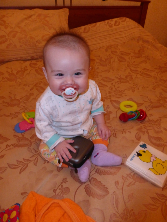 Потом - мягкие игрушки. Любит кусать рожки у пчелы. наши прорезыватели - не пользуемся никакими, кроме осла. он оказался прорезывателем. ну и конечно музыкальные игрушки. они - самые-самые для Катюши сейчас самые-самые. неваляшка-лисичка тоже занимает надолго. Мобиль не заинтересовал, поэтому сняли.