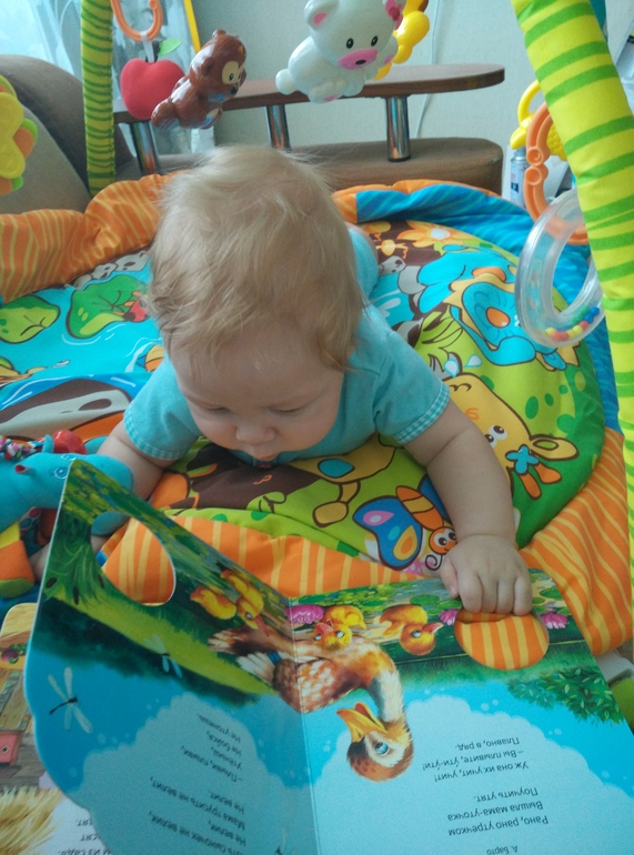 К 5 месяцам мы активно переворачиваемся,со спинки на животик и обратно, правда только через левое плечико, через правое тоже умеет, но крайне редко, пытаюсь контролировать этот процесс, и подкладываю игрушки или подушечку слева, от безысходности приходится поворачиваться вправо, ну или просто можно начать психовать и мама сразу убирает свою баррикаду)) С появлением этой умелочки, практически сразу появилось страстное желание ползти, по началу сын был похож на жучка, ножки ручки задираем и машем -машем, в надежде прокатиться на пузике) но поняв через неделю, что это не вариант, и нужно менять методику, он активно начал задирать попку кверху, снова провал, но он не сдавался, ручки видимо тоже для чего то нужны, начал приподнимать верхнюю часть туловища. В принципе, на этом мы пока и остановились, поочередно поднимаем, то низ,то верх, а как это совместить пока не понятно,но думаю скоро мы научимся, и конец, относительно спокойной жизни))