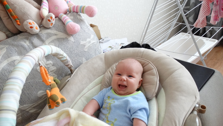Очень рада, что есть у меня шезлонг и слинг. В шезлонге спит днем. А еще можно спокойно отлучиться в туалет или на кухню ненадолго- знаю, что этот круть-верть не скрутится с дивана. И так забавно- вот она лежит в шезлонге, попискивает и жирафика рассматривает, а потом через минуту уже спит. А еще шезлонг ей помогает пропукаться в иные дни- уж не знаю, может форма такая удачная. Слинг тоже очень выручает- особенно, когда ей хочется пообниматься и поспать рядом со мной, а мне нужно что-то прибрать, кушать приготовить.