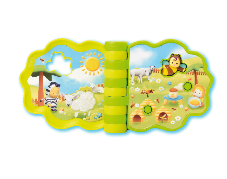 Большой плюс — пластиковая, служит дольше бумажных, и эти так называемые тактильные элементы они хорошо придумали, нравится дочке трогать их.По звуку претензий нет, пчелка работает, до сих пор "ням-ням" говорит.