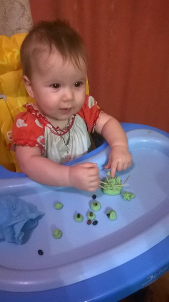 Любит ходить держась за две руки, пинать мяч. Отлично проталкивает бутылочные пробки в круглое отверстие, но так и не понимает как затолкать крышки баночные в прямоугольную прорезь)) Выучили корову, лошадку, свинку, овцу и козу. Куриц и петуха по-моему, забыла.