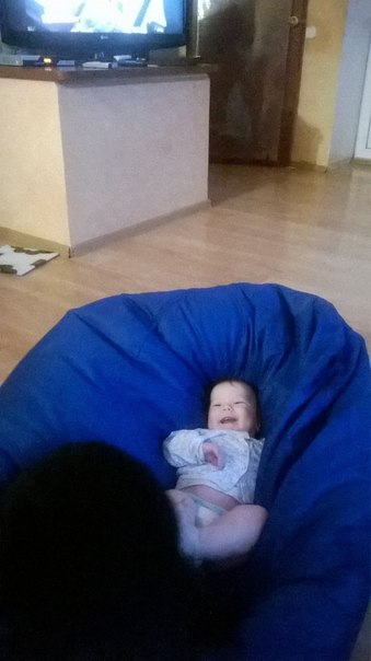 Там столько всего интересного! У Романа весело покувыркаться на его широком ложе, у Никиты играет в солдатиков и рассыпает из банки карандаши и фломастеры, а у Димы ползает под стулом. Еще Дима катает Ксюшу на пуфе.