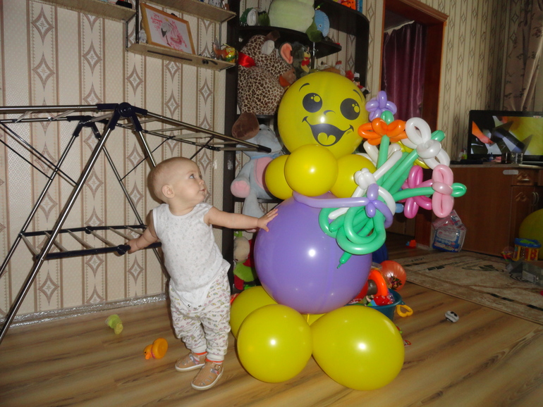 Веселый чувачок у вас)))Представляю,как рада малышка) Я своему мужу тоже голову морочу, сделали цифру 1 из пуговиц(прикрепили к ткани горячим клеем). Еще идея из нета - фотки от 0 до 12 мес наклеить на ватман,чтоб гости умилялись,как рос ребенок)))