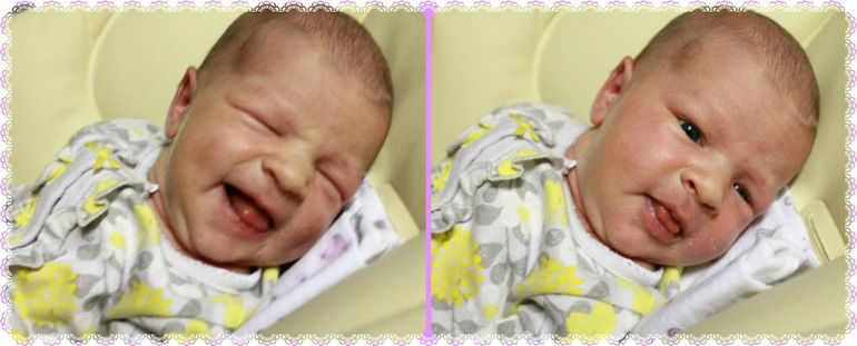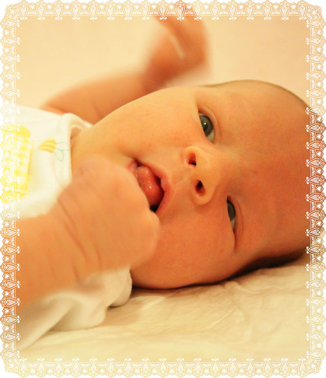 Уже сосредотачивает взгляд, когда я с нею разговариваю, сначала удивленно смотрит на меня и затем расплывается в улыбке, такая сладенькая! Лежа на животике на несколько секунд поднимает головку. Оборачивается на звук погремушки. Пока это все наши умелки.