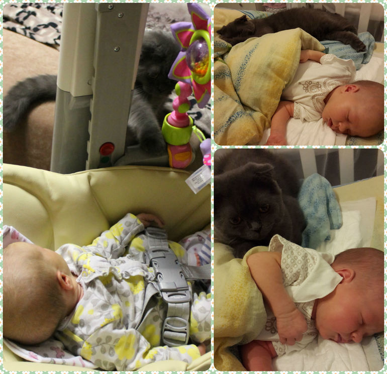 Еще у нас есть усатый нянь, который тоже постоянно рядышком с малышкой. И на качелях покачает и сон постережет)))