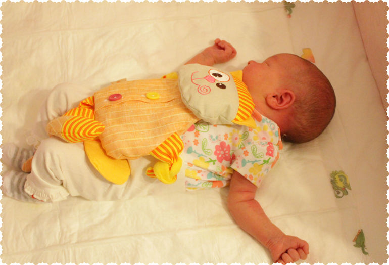 В целом, эти три недели не были тяжелыми. Тьфу-тьфу-тьфу ни одной бессонной ночи. Да и днем мы не капризничаем. Сказать, что колики нас не беспокоят...не знаю... да, она не плачет, но кряхтит, тянет ножки, часто пукает... Бывает днем почти все время висит на сиське, вроде спит уже, кладу в кроватку, минут через 5-10 снова крик и ищет грудь. Сначала думала просыпается от того, что перекладываю, стала кормить лежа на моей кровати и когда она засыпала просто оставляла спать ее на ней. Спало немного лучше, спала минут по 30-40, а потом опять кряхтит... Тогда я купила "Доктора мякиша" - грелочку с вишневыми косточками,