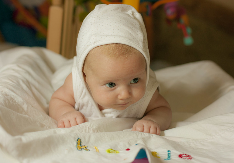 Смотрим на мобиль и по сторонам, благодаря чему мама может отойти в туалет или на кухню, не вызвав дикий плач. Она уже сама развлекает себя!