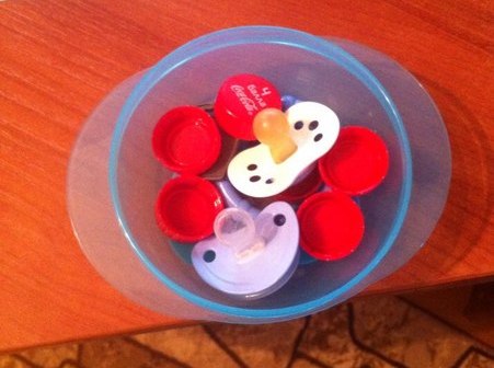 Взяла тарелочку на присоске и туда скидала маленькие предметы (крышечки, соски и т.д.)