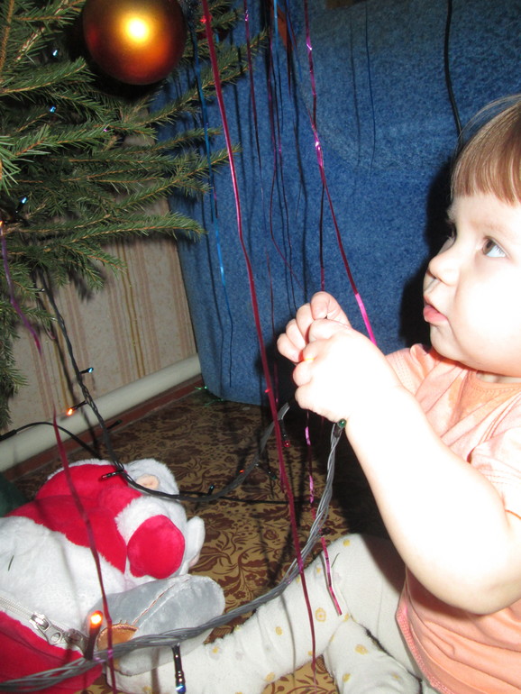 Не трогает -и хорошо, уж лучше пальчиком показывать! У меня старший ел мишуру, а младший низковисящие игрушки ногой пытается пнуть, блин футболист:( а Лиза молодечик, и так хорошо ей возле елочки;)