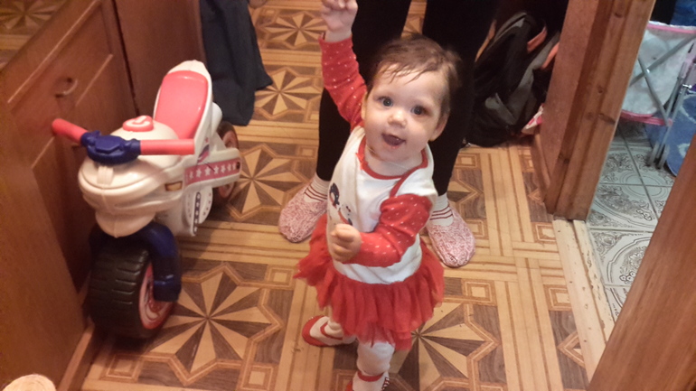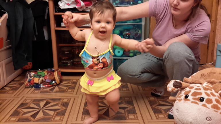Из умелок в этом месяце научились стоять уверено и пытается стоять без рук иногда получается, а вот в доль опоры не хочет ходить, и за ручки тоже не любит ей больше нравится ползком)).В еде все также превиредничает в почете у нас сися, если ей надо подползет ко мне забирается на колени отодвигает майку и кушает короче самостоятельный ребенок))).а еще любит ту еду которая кушает сестра это у нее в почете))) а Настя девочка не жадная все дает))).