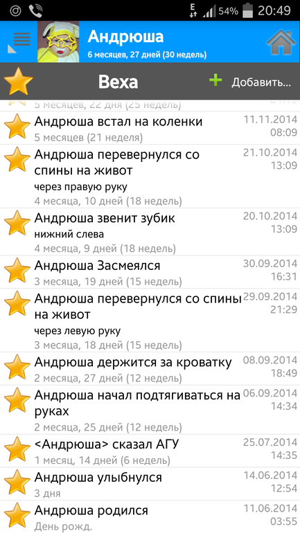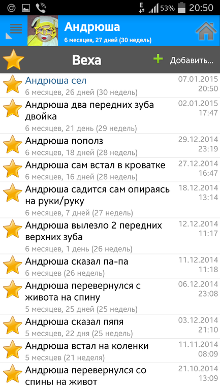 11 января нам будет 7. Мы уже сами садимся и сидим уверенно. Встает в кроватке уже давно, встает у любой опоры, ходит вдоль нее, научился снимать горизонтальную балку борта кровати, встает и мальчиком крючок снимает с двух сторон! Он конечно молодец что сообразил как это делать, но одного оставить страшно, снимет балку и может выпасть. Еще мы ползаем давно, начал резко и шустро, до этого с 4,5 мес активно раскачивался на коленках. Еще хочет ходить, вот подползет ко мне встанет, повернется руки убирает и топает, падает конечно ведь рано еще, но ему это не объяснить, он во всем такой, все начинает делать раньше времени, и пытается пока не научится))) Первый зуб а точнее сразу два вылезли в 4.5. Сейчас уже 6 зубов! Болтает часто, говорит пя-пя, па-па, аба, тятя, дада. Мама сказал один раз когда подруга в гости пришла а он ее испугался бедный)))