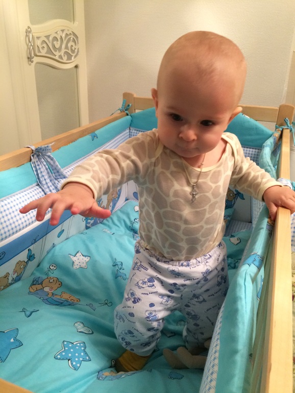 Итак, на 8,5 месяцев) можно сделать вывод, что восьмой месяц был очень продуктивным. Мы научились сами хорошо и уверенно садиться, вставать, появилось много новых движений, видно, что мышцы физически стали крепче и более развитые что ли. Ползал Левик также по-пластунски. Но вот как только прилетели мы к бабушке, зашли домой. Я положила Леву на большую кровать и он пополз на четвереньках. Да сразу так, будто все время это умел делать! Я приятно этому удивилась! Радости было очень много) ведь я уже думала, что он так и будет ползать и в итоге быстрее пойдет)