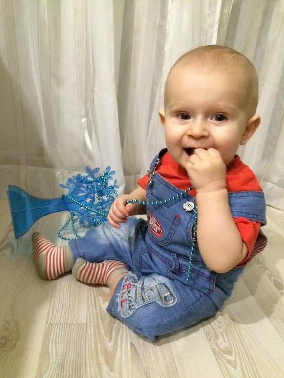 За время с 7 до 8 месяцев мы вырастили два нижних зубика. А за пару дней до нового года я обнаружила у нас еще два уже прорезанных резца сверху, причем не первых, а вторых! Что-то я даже не заметила как они резались! На месте первых верхних резцов десна была припухшая и видно было, что скоро вылезет еще и правый зубик) ох, совсем зубастыми становимся))) в результате на новый год мы сидели с соплями и поносом (простите за подробности, девочки). И все мои планы выйти куда-то обрушились крахом, а бедный наш кроха не мог нормально спать из-за того, что сопелки мешали ему... Зато ко 2 января они прошли, будто их и не было, а в ротике зазвенел еще и пятый по счету зубик - первый верхний правый резец! Ура-ура!!!!! На Рождество появился еще и левый верхний первый резец! Вот так зубастый новый год у нас получился) теперь мы обладатели шести остренький зубиков!