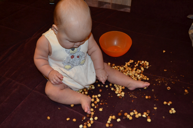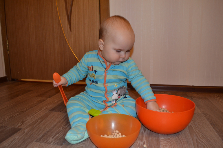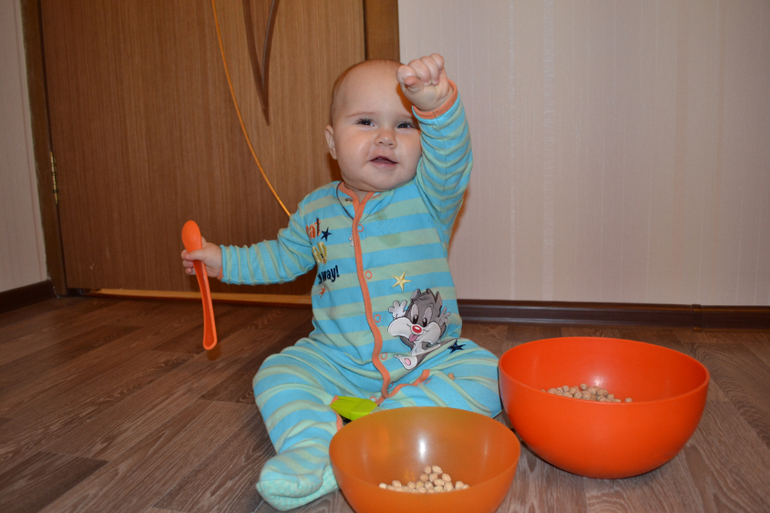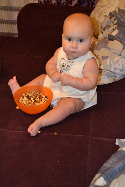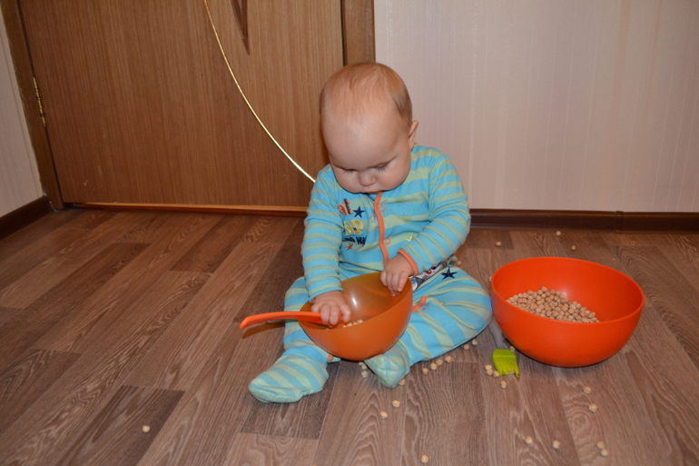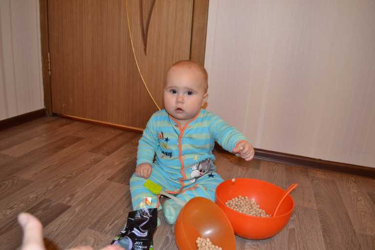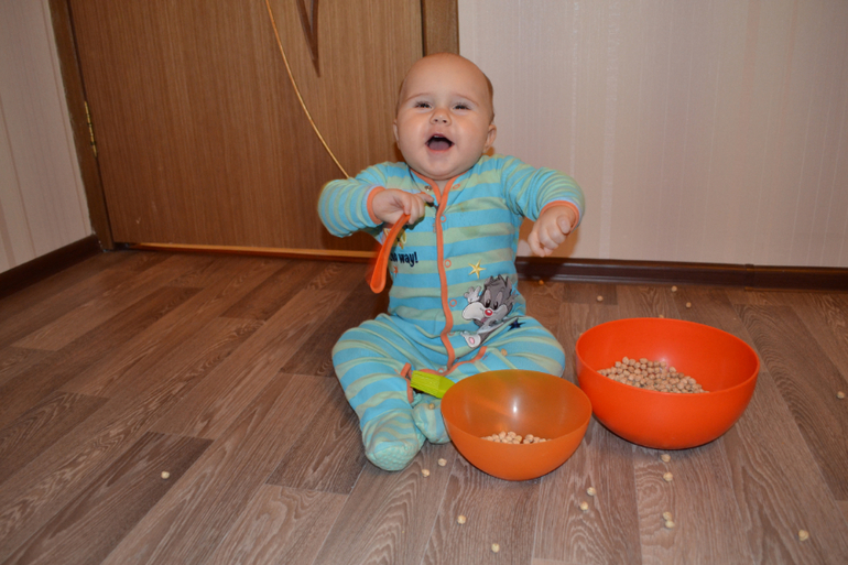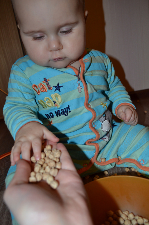 А вот это нут - турецкий горох. Не знаю, насколько он пригоден в пищу, покупала его специально для занятий с ребенком. Только сейчас заметила, что одинаковый комбез на двух последних занятиях, хотя разница между ними месяц)) Это сегодняшние фото 8,5 месяцев.