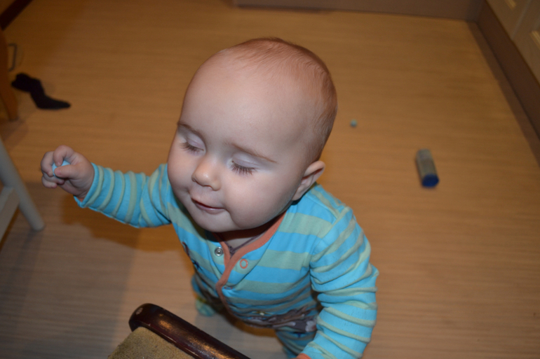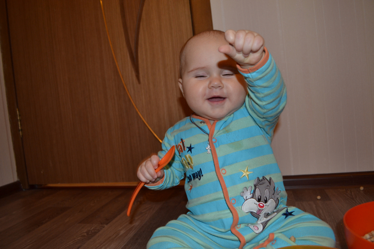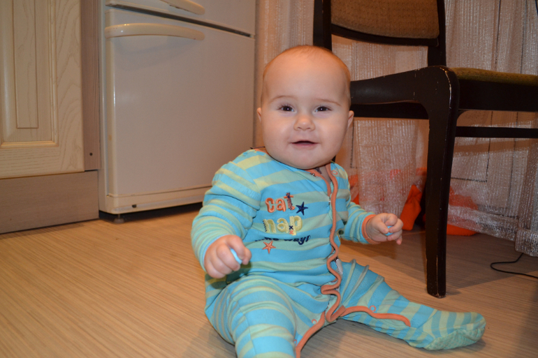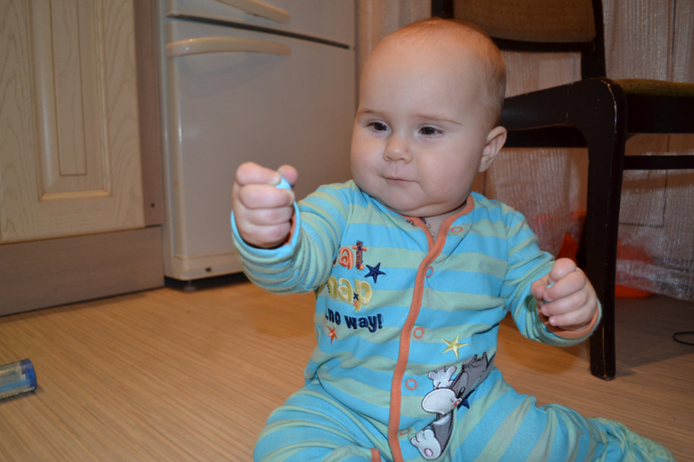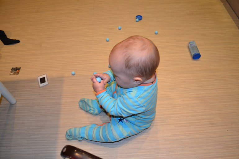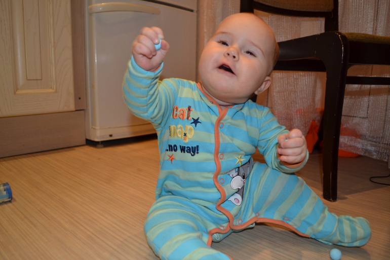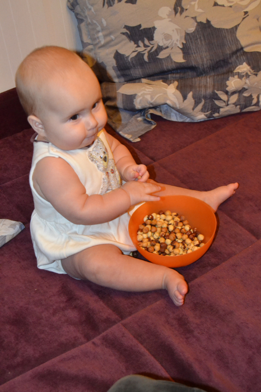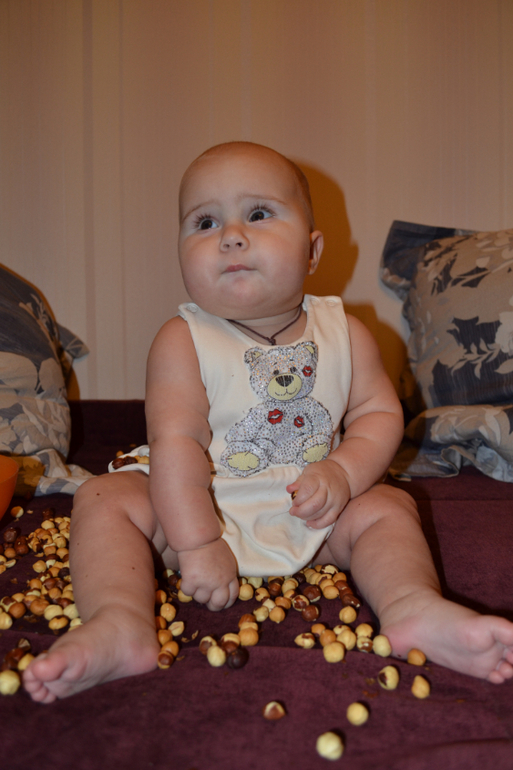 А вот это нут - турецкий горох. Не знаю, насколько он пригоден в пищу, покупала его специально для занятий с ребенком. Только сейчас заметила, что одинаковый комбез на двух последних занятиях, хотя разница между ними месяц)) Это сегодняшние фото 8,5 месяцев.