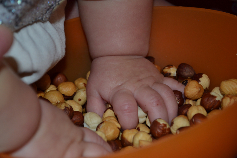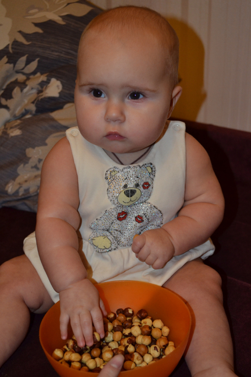 Ну в общем это фундук. Сразу предупреждаю - после такого занятия весь диван и пол у нас был в шелухе, но я была к этому готова и наготове стоял пылесос! Зато на ощупь фундук очень приятный и дочке нравился процесс отхождения шелухи от самого орешка.