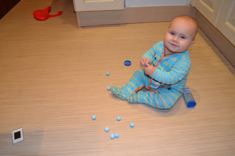А это дочь притащила из ванной сама, получилось очень спонтанное занятие, но я успела запечатлеть))) Это шарики для ванны для ног, они приятно пахнут и классные на ощупь, еле отобрала))) Тут уже 7,5 месяцев: