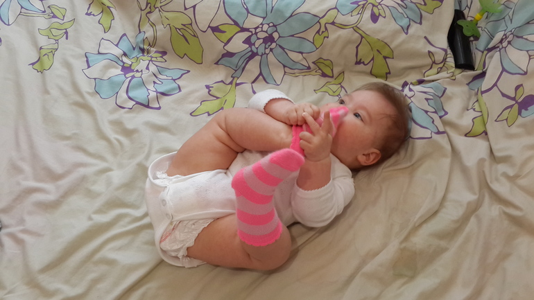 Ника активная девочка,ловко переворачивается на животик через оба бочка,обратно пока никак.Научилась ползать по пластунски.Это так смешно.Задирает попу кверху и отталкивается при этом немного помогая себе ручками.На вытянутые ручки пока не встает.