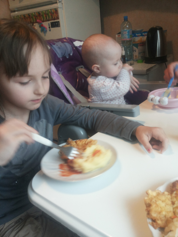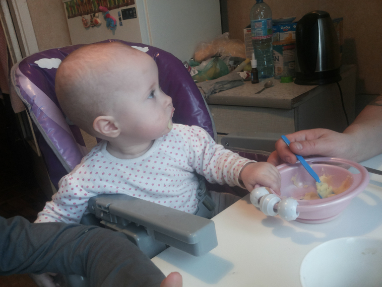 -Приучаем есть за общим столом. Очень нравится, что она как и все мы сидит кушает как взрослая со всеми.