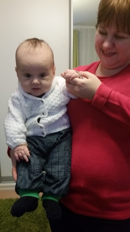 Отличный парень! Красавчик! Белый свитерок оченьему идет со штанцами)) Если молока меньше, побольше давай висеть на груди, особенно ночью... Да ты и сама наверное знаешь. А как укладываешь на ночь? Помогает маятник? У меня тоже кроватка с маятником, но я уже и не мечтаю об отдельном сне. Забыла уже, когда мужа видела вообще:) Выздоравливайте скорее!