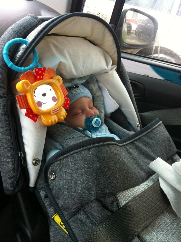Милый парнишка! А вы учили его погремушку брать в руку? Или он сам начал тянуться к ней? Что то наша доча не хочет держать погремушку. У нас кстати такая же игрушка с зеркалом, как у вас на автокресле висит..нам в роддоме подарили)
