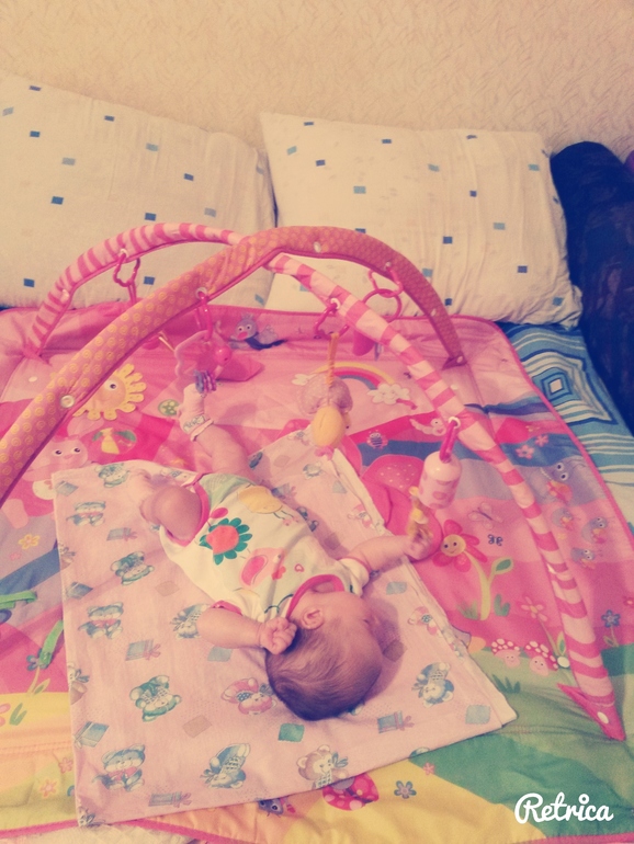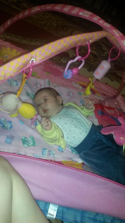 Она сама не шелестит, мы ей. а она прислушивается и улыбается) шелестит сама только на погремушке) но игрушки с коврика пока не хватает(