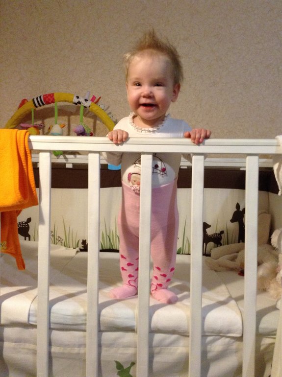 Всю предыдущую неделю Юля, цепляясь за любую даже не знаю что, правильнее сказать за любое все, что попадает под руку (папа, сестра, собака, мама, мамины шаровары, подушка-болстер, тумбочки, ручки всего и прочее, прочее, прочее), вставала на колени. И все, на этом была точка. Или вставала в собаку мордой вниз, правда в свою собственную интерпретацию этой асаны, с задорно торчащей головой вверх, и приседала. А сегодня я проснулась от возмущенного вопля. Ребенок стоит у бортика кровати и практически устраивает восстание. Возмущение было вызвано тем, что встать-то у нее получилось, а как опуститься она не знает(((((((. А падать, откидываться и опрокидываться, это она уже знает, очень больно. Сделать фото конечно же не успела, надо было спасать человека. Зато вечером после обливания из поильника, это ее самое любимое в прикорме, повторила для меня еще раз на бис. Теперь у меня веселые пару недель ждут, потому что чувак будет пытаться вставать везде, а я буду ловить. Сегодня умудрилась приложиться два раза, причем на мягкий пол не падает, заваливается исключительно там, где его нет или вообще о вертикальные поверхности.