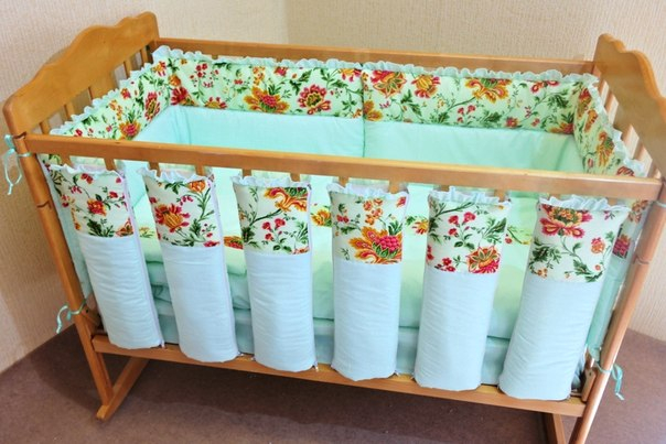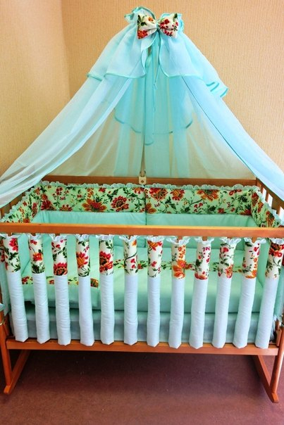 Новейшее изобретение в царстве бортиков для детских кроваток! Теперь, с нашими бортиками на передней стенке кроватки видно, спит или бодрствует малыш! Воздух гуляет между планками, ничто не мешает следить за малышом. Каждая планочка мягко обтянута бортиком , который очень легко застегивается на разъемную молнию.Бортики можно перестегивать как вам захочется, и по два, и по три, и по четыре, а также соединить их все между собой и тогда вся кроватка будет закрыта!Отделка в комплекте из брендовой ткани европейских производителей, полностью х/б.