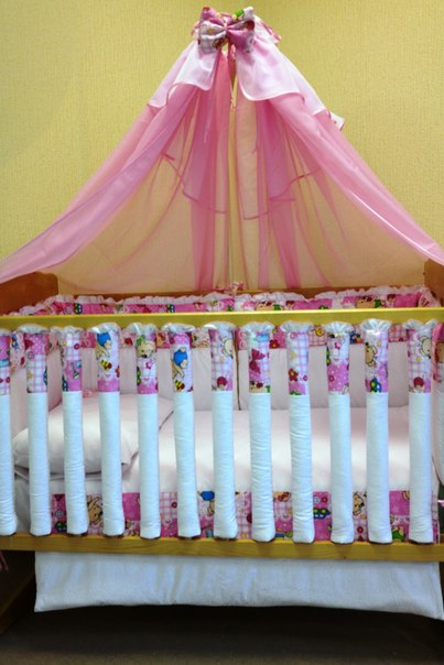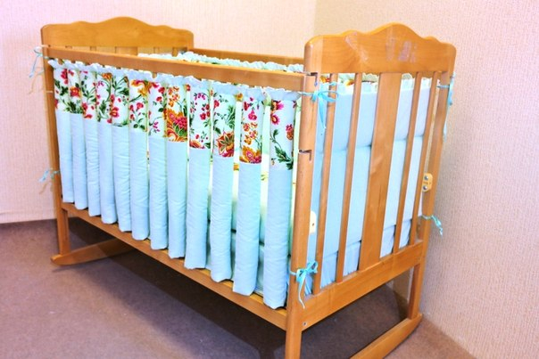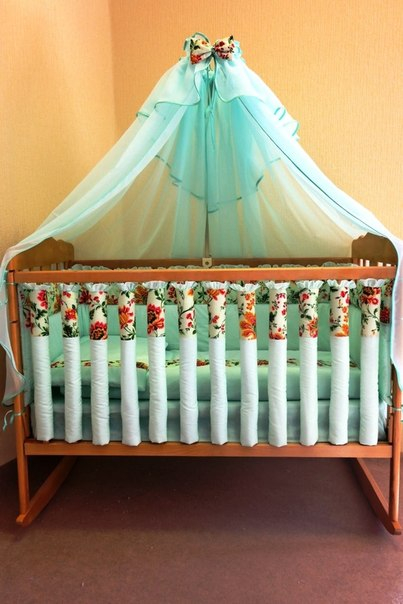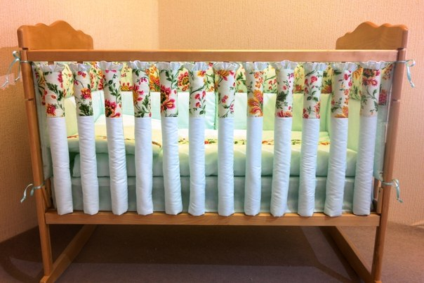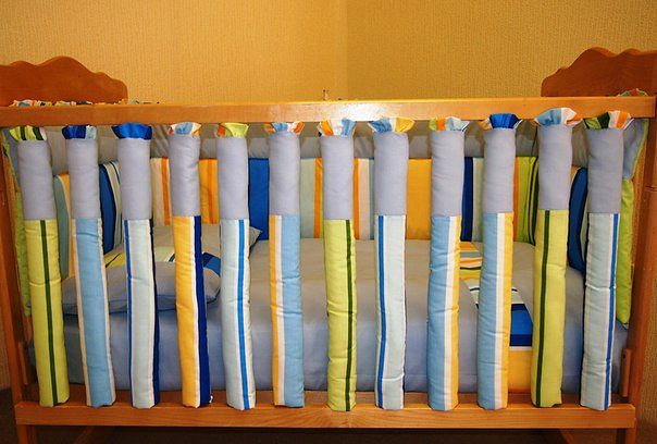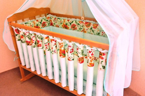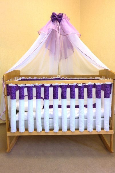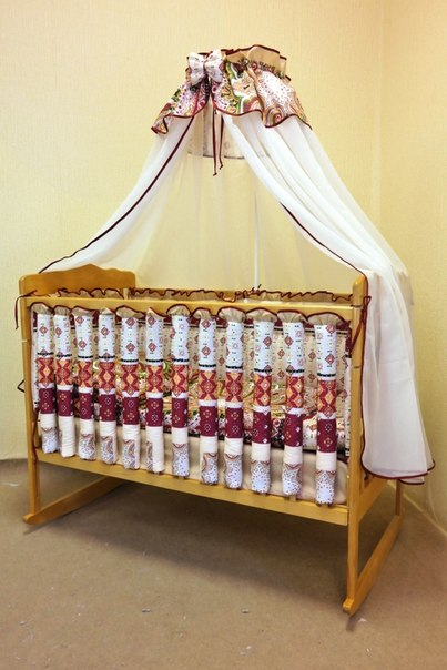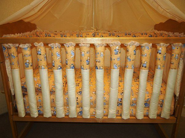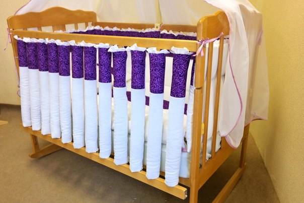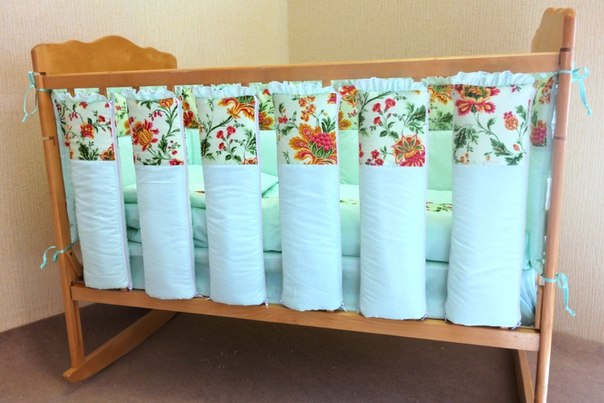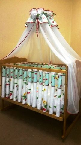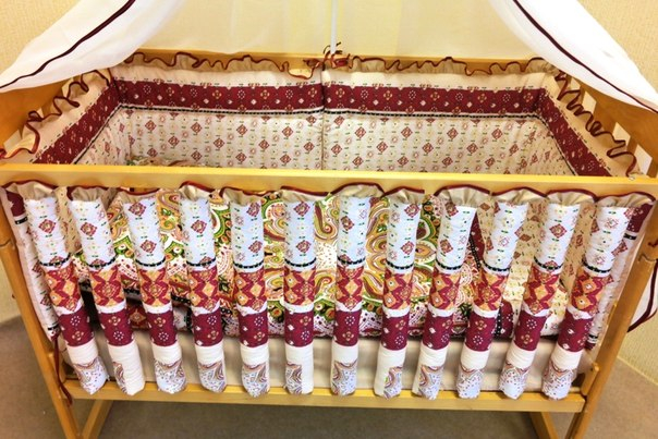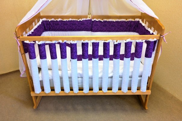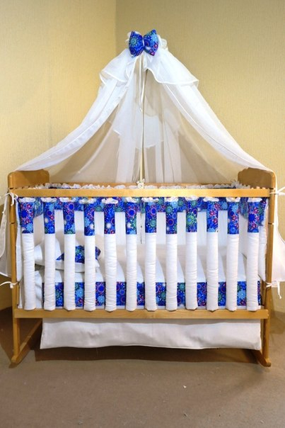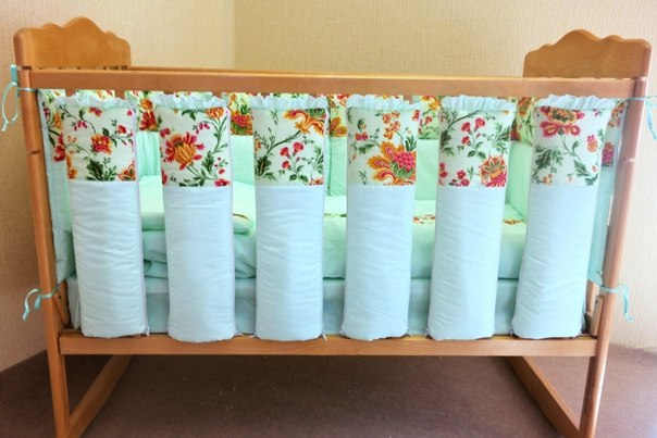 Новейшее изобретение в царстве бортиков для детских кроваток! Теперь, с нашими бортиками на передней стенке кроватки видно, спит или бодрствует малыш! Воздух гуляет между планками, ничто не мешает следить за малышом. Каждая планочка мягко обтянута бортиком , который очень легко застегивается на разъемную молнию.Бортики можно перестегивать как вам захочется, и по два, и по три, и по четыре, а также соединить их все между собой и тогда вся кроватка будет закрыта!Отделка в комплекте из брендовой ткани европейских производителей, полностью х/б.