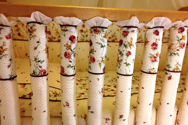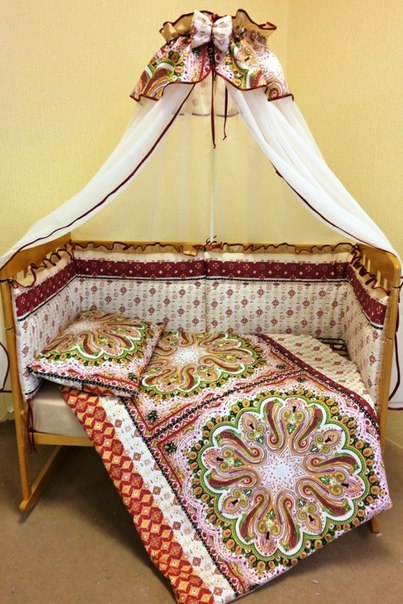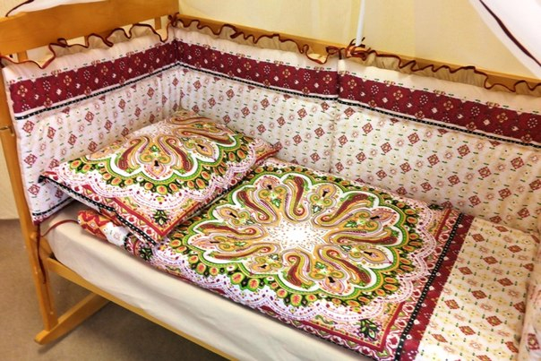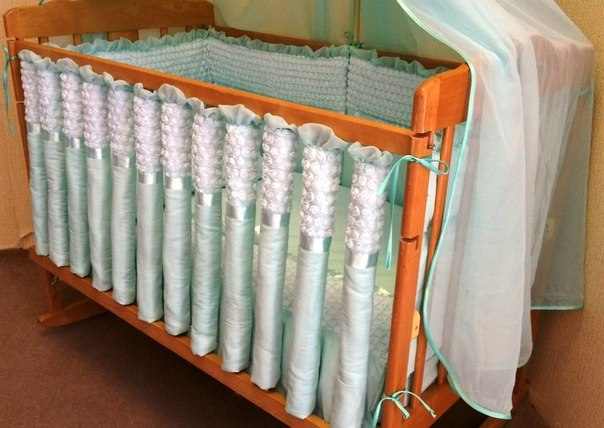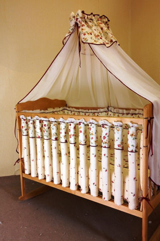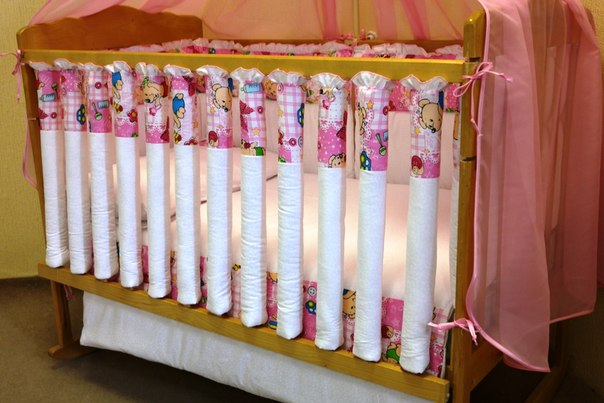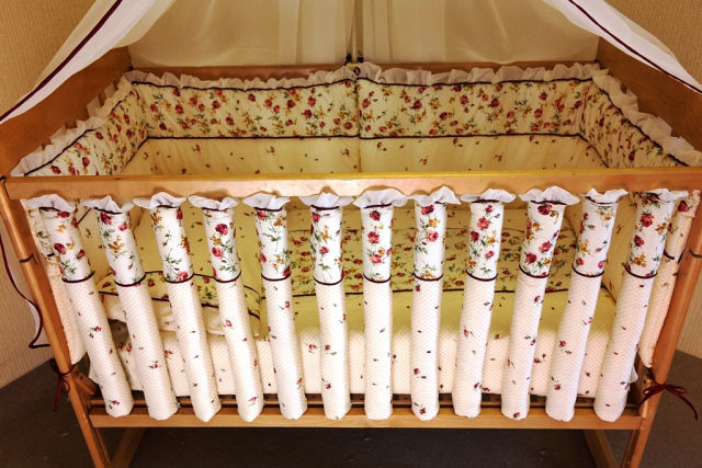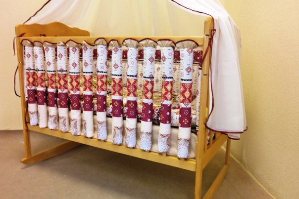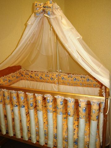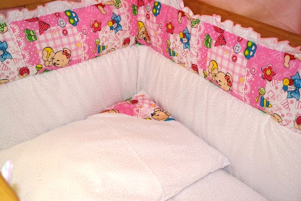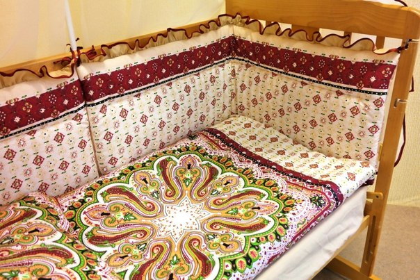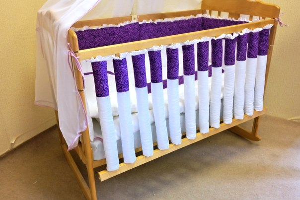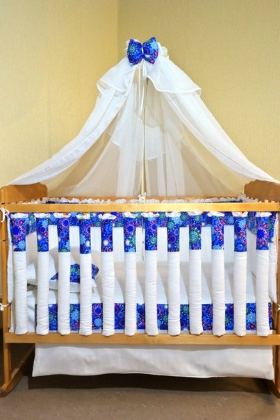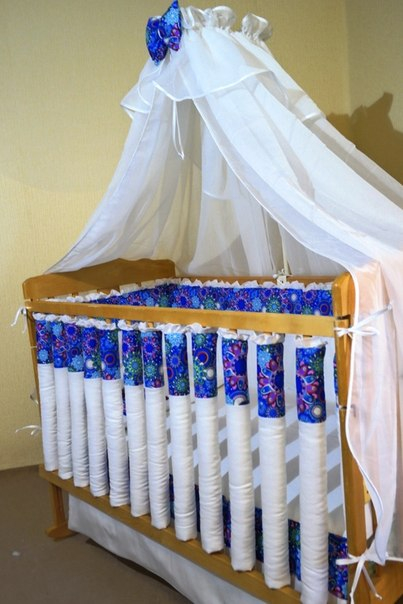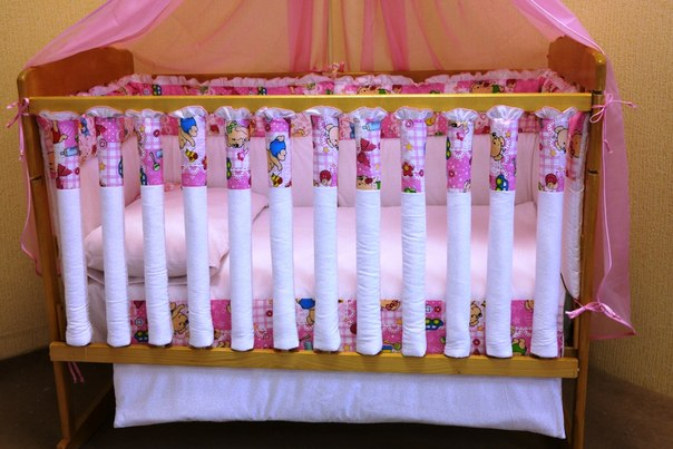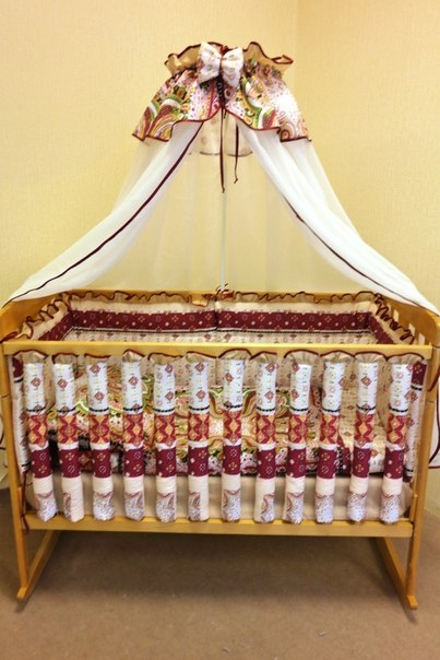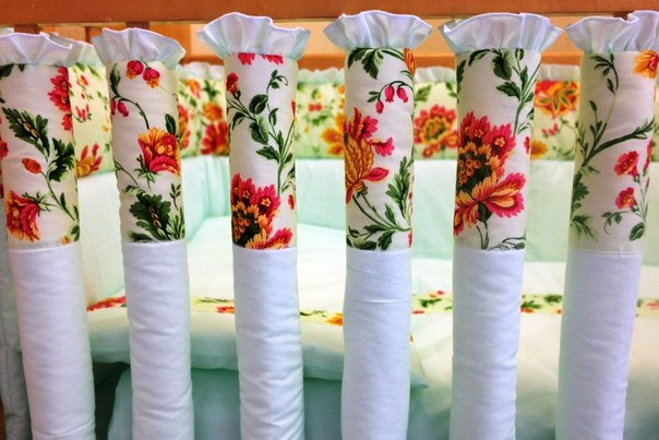 Новейшее изобретение в царстве бортиков для детских кроваток! Теперь, с нашими бортиками на передней стенке кроватки видно, спит или бодрствует малыш! Воздух гуляет между планками, ничто не мешает следить за малышом. Каждая планочка мягко обтянута бортиком , который очень легко застегивается на разъемную молнию.Бортики можно перестегивать как вам захочется, и по два, и по три, и по четыре, а также соединить их все между собой и тогда вся кроватка будет закрыта!Отделка в комплекте из брендовой ткани европейских производителей, полностью х/б.