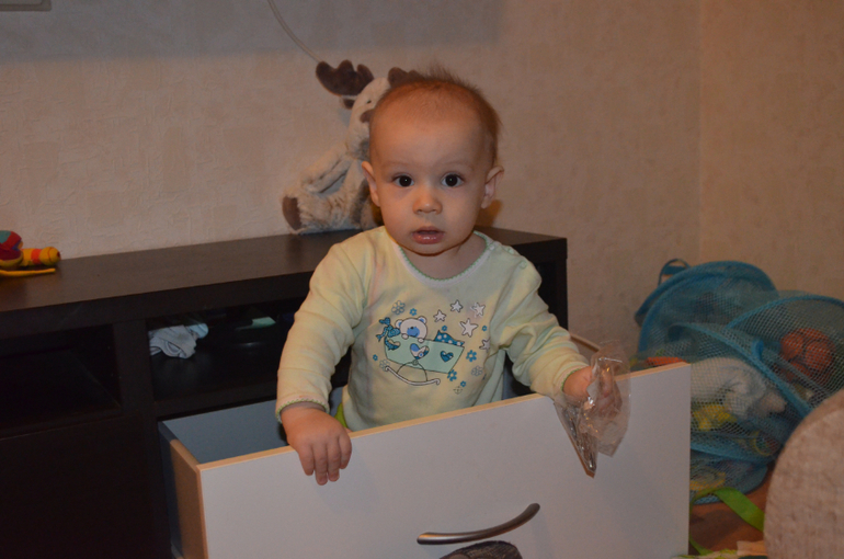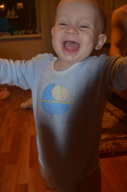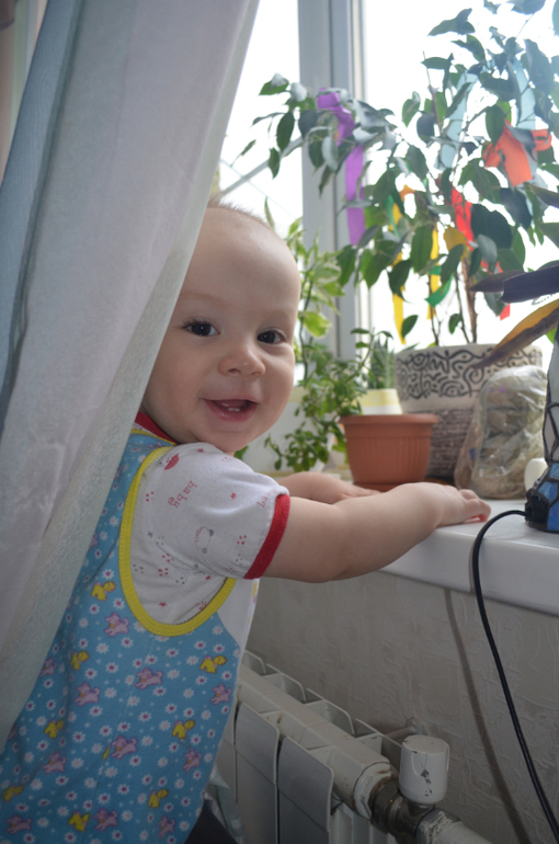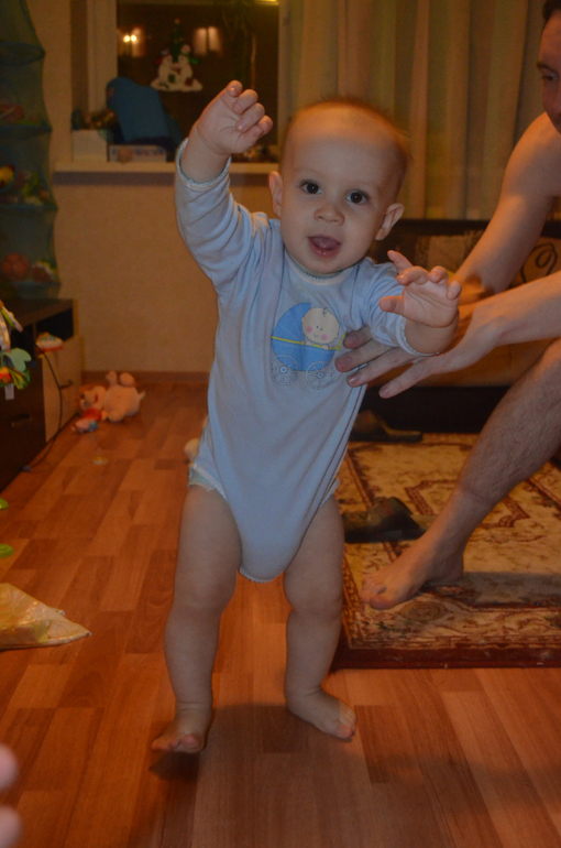 Рома все так же ползает.Ходить,поросенок,совсем не хочет.Ему быстрее доползти.Но от дивана до тумбочки ходит сам и от папы до мамы.Не знаю когда уже пойдет(((