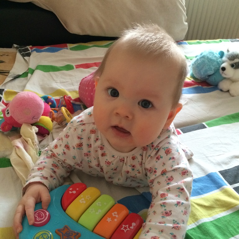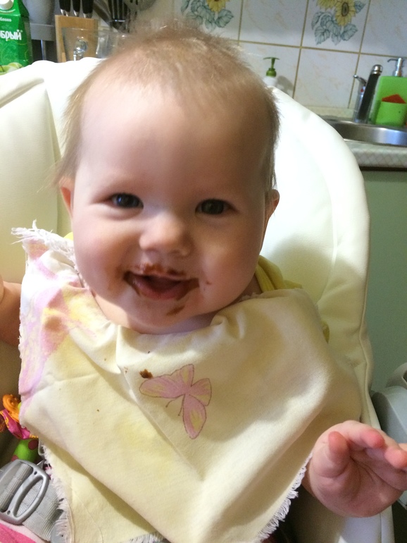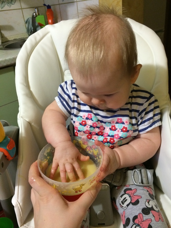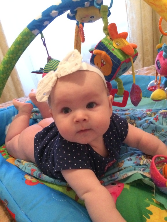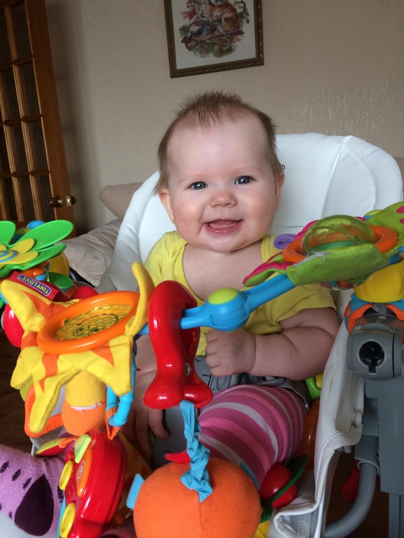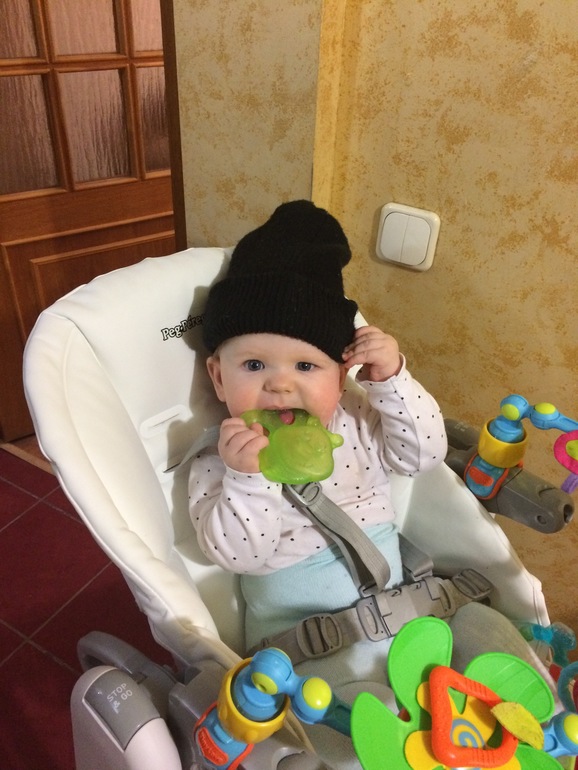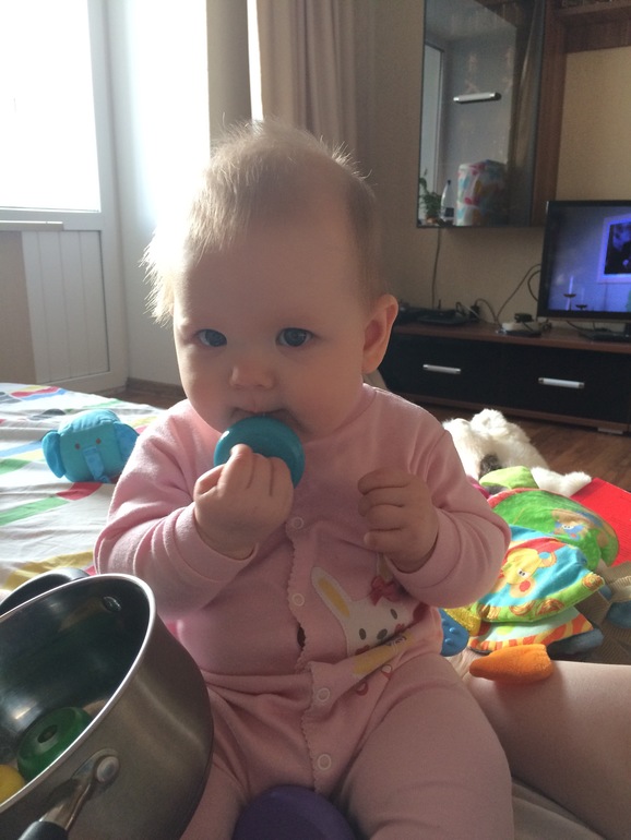 Наши умелки, все слышит что где происходит, очень заинтересованна, если например бежит собака по квартире, а Вареник сидит в шезлонге, так на цокот когтями аж голову выворачивает на звук. Так забавно! Хватает все, хочет особенно пульт, телефон, кашу в тарелке и всякое запрещенное и интересное. Мы сидим, но только когда посадят, раскачиваемся на четвереньках, не стоим у опоры, не говорим мама и папа, не ползаем на четвереньках, ползаем на животе назад, катаемся в ходунках, чаще назад чем вперед, но учимся, вреда в ходунках я не вижу, все мои родные и я катались и никто не умер. Также прыгаем в прыгунках, но больше нравится когда мама дергает за ноги вверх и вниз и Варя прыгает) Вообще она такая интересная стала, забавная. Еще больше мамина дочка, не дай Бог мама отойдет хоть на минуту, глаз с меня не спускает) Когда кушает, прямо нападает на ложку, из за этого вся татамия в каше, еще любим в перерывах между ложками каши/пюре помусливить подлокотники этой же татамии. На днях мы сняли памперс и одеваем только на ночь, в один день примерно 4 штанов, и я их по очереди спаласкиваю и сушу. Спим днем и не писаемся. Наладился у нас наконец какой то режим