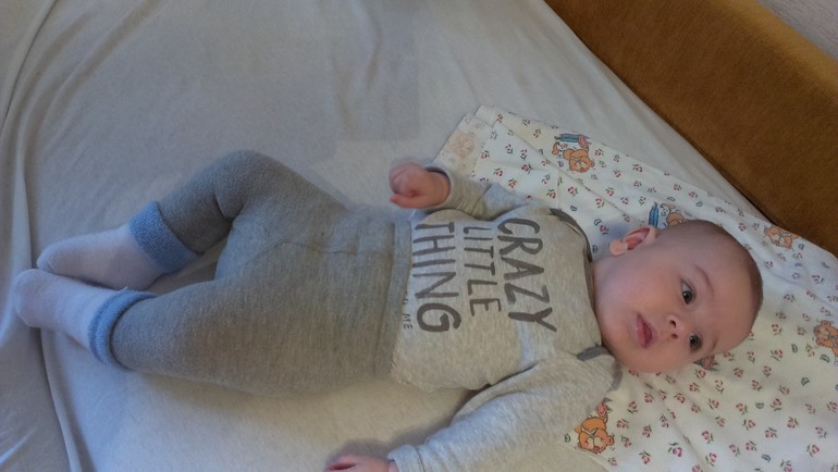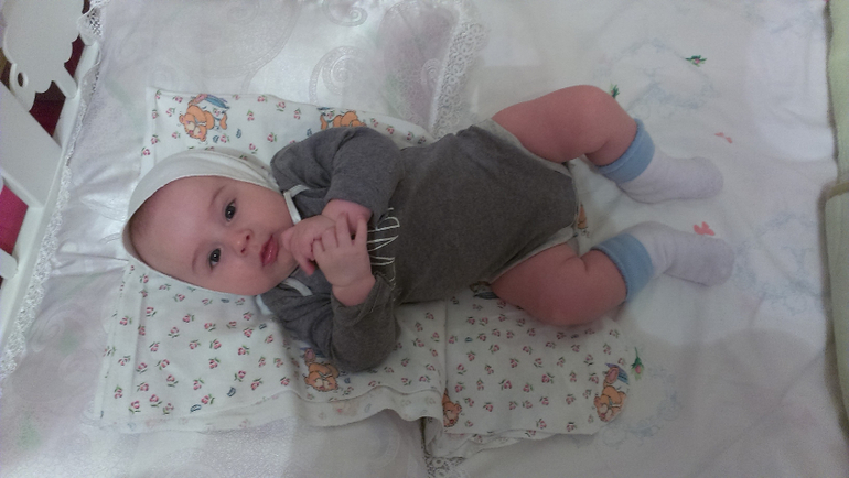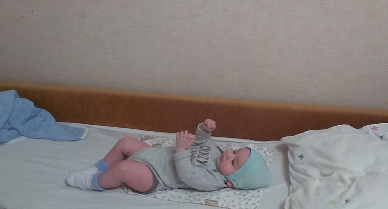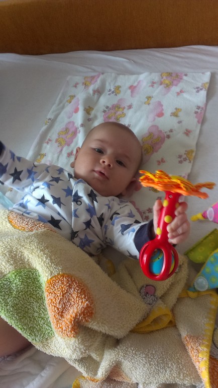 В 2 мес.и 22дня Саня перевернулся на животик,с тех пор еще раза три перевернулся,сам наверное не понял как это случилось,на бочок любит поворачиваться.Следит внимательно за игрушками,тянет ручонки,хватает правда в охапку))Если вставишь погремуху в ручку удерживает ,машет им пока себе по голове не даст))Обожает сестренку,наблюдает внимательно за нашими передвижениями по квартире.На меня смотрит ,как на бидон с молоком)))