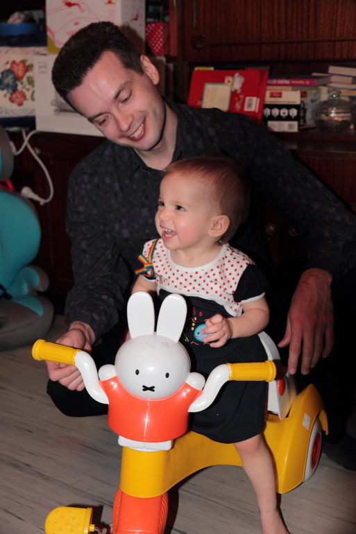 Собирает пирамидку (корявенько, но собирает), кидает мяч, дает когда просишь что-либо , вообще многое понимает, но вот говорить пока отказывается. Показывает на картинках бананы, зверей и детей с переменнным успехом. Полюбила листать книги, но погрызть их тоже не забывает. Показывает как надо спать в кроватке, но ессно спит с нами. Любит складывать-доставать из разных коробочек. Подаренные на год подарки пока стоят, они все с какой-то дикой озвучкой, ребенок боится. Даже резиновый конь ржет! Зачем?