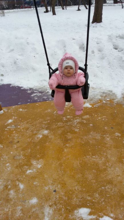 Попробуйте через недельку еще раз, должно понравится). Может сначала покачать ее на больших качелях на коленках? Я сеня думала с таких начать, но к большим уже другой малыш постарше подбежал, остались только для малышей)).