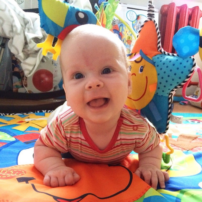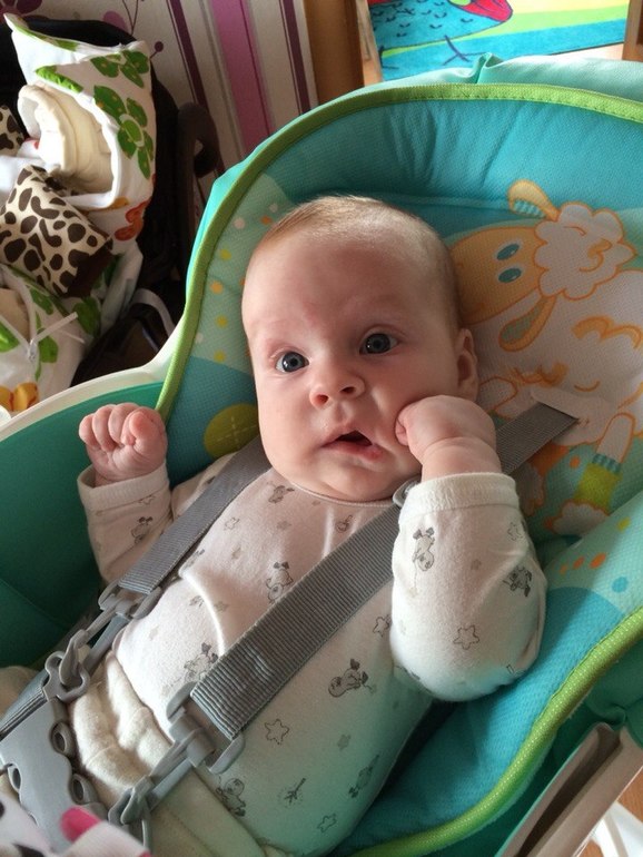 Про умения. В 2.17 дочь очень удивила нас переворотами с живота на спину. Повторив этот трюк четырежды за день она, судя по всему, решила что хватит с нас цирковых представлений и больше ничего такого не вытворяла. Лёжа на животе пыхтит, вертит жопкой, облизывает коврик, руки, меня и вообще всё, до чего дотягивается, но больше не вертится. Ну что ж, будем ждать, когда ей это опять станет интересным) В арсенале появляется всё больше и больше разнообразных звуков - писк, визг, всяческие "бррр", "гууу" и "уааа". По вечерам может по полчаса беседовать с отцом, причём с таким лицом, будто обсуждают они как минимум теорию струн. По паре минут держит погремуху, правда только если вложить её в руку. Пока что толком не понимает, что с ней делать и чаще всего лупасит ей себе по лбу или облизывает. Из всех подвесных игрух на кроватке и дуге стульчика неизменный фаворит - огромная бабочка. Может по 20 минут залипать с ней и дёргать за всякие колечки