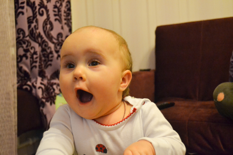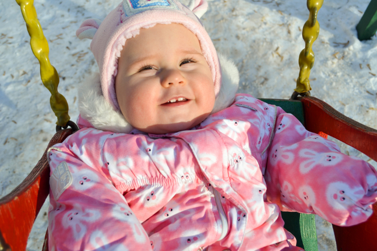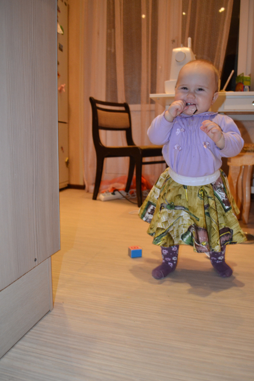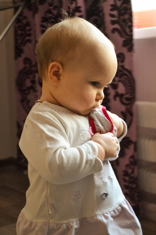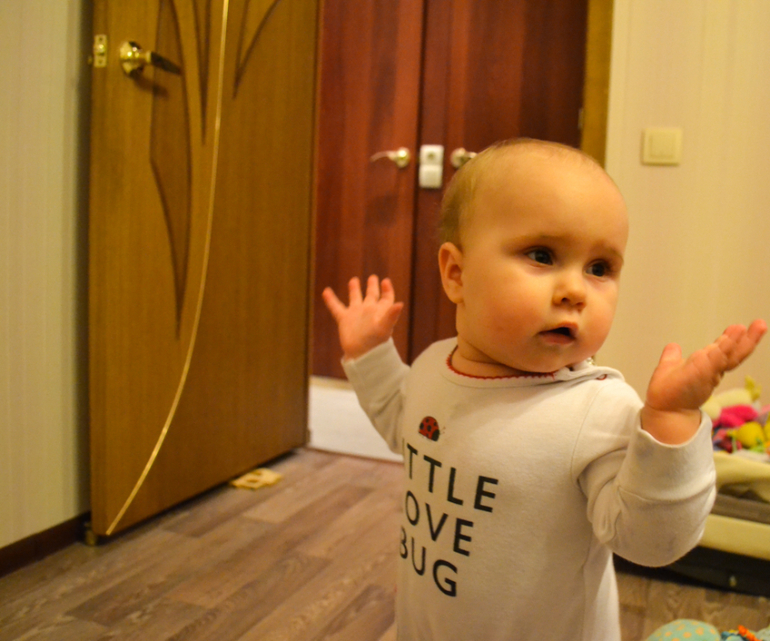 Из новых умелок: в прошлом месяце научилась играть в ладушки, а в этом уже не только хлопает в ладоши, но и полноценно показывает, как «полетели» и «на головку Насте сели». Делает «воздушный поцелуй» очень мило)) Показывает «нету» - разводит ручки и разворачиват ладошками вверх - это так забавно получается, что я постоянно прошу ее показать) Еще бабушка научила показывать «какая Настя большая» - поднимает руки вверх. Оттачивает мастерство хождения - научилась даже ходить на улице в зимнем комбезе и сапогах, еще плохо, но уже прогресс! Прибавилось в наш словарный запас слово «да» (часто говорит) и изредка «дед» или «деда». Научилась залезать на не очень высокие предметы, как ее каталка, стул, ручка дивана.