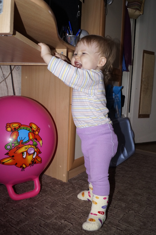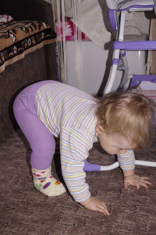 Стоять без опоры и ходить самостоятельно побаиваемся. Ну, ничего. Мы не торопимся. Подождём. Доча сделает всё сама, когда посчитает нужным.