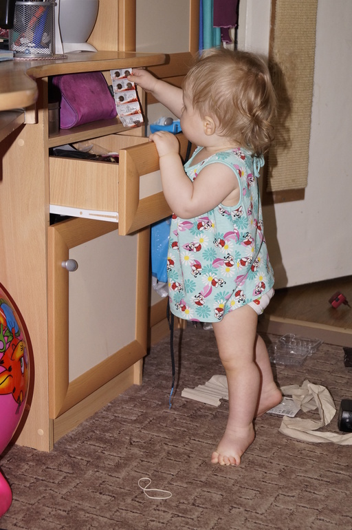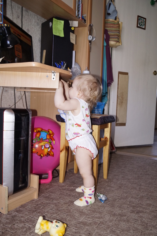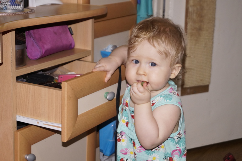 Постоянно залезает в ящик компьютерного стола и выкидывает из него всё, что попадается под руку. А если не видно, что там лежит, то приподнимается на носочки и заглядывает. А когда лезет туда, куда нельзя, то я ей говорю:" Вика, нельзя! Вике попу та-та!!!" Дочь смеётся и хлопает ладошкой себя по попе. И не лезет куда собиралась до следующего раза.