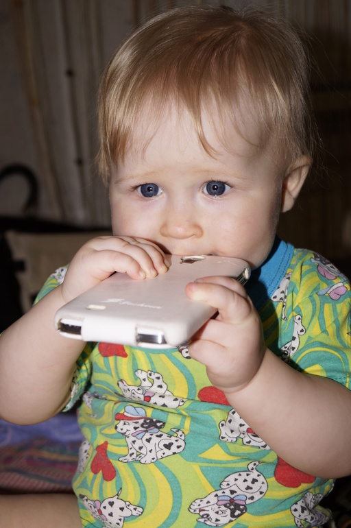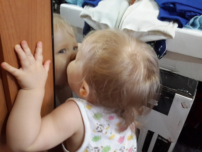 Научилась в целовать саму себя в зеркале, в телефоне у папы.